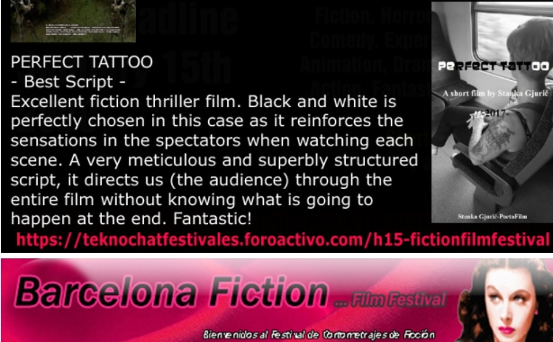 Film Stanke Gjurić ‘Perfect Tattoo’, koji je na dva festivala u Španjolskoj i Argentini već osvojio dvije nagrade, onu za najbolji triler, kao i onu za najbolji film fikcije, upravo je na IMDb kvalifikacijskom festivalu festivalu ‘Barcelona fiction’ osvojio i nagradu za najbolji scenarij. U objašnjenju za dodjelu nagrade, žiri je napisao: