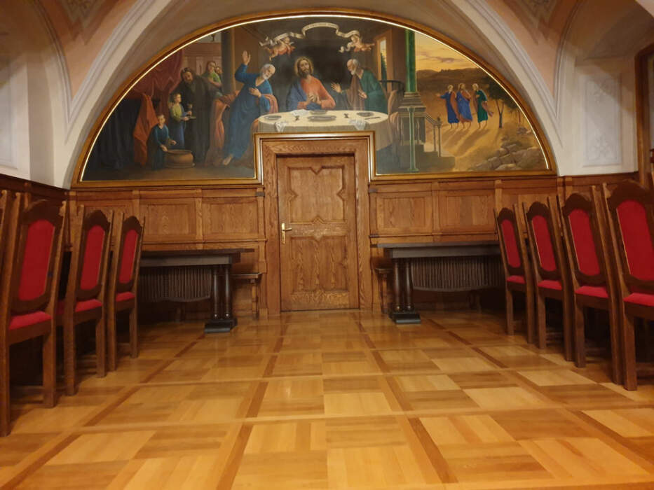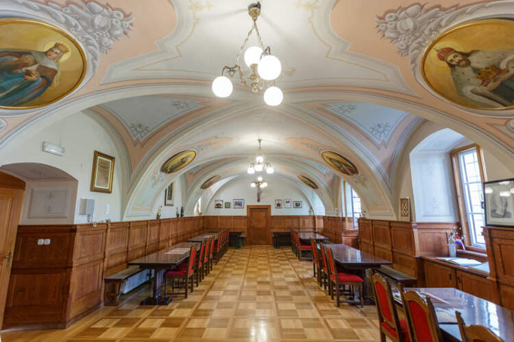 Samostanska blagovaonica središnje je okupljalište redovnika. U njoj su se uvijek nalazile vrijedne umjetnine. Prikaz „Večera u Emausu“, umjetnički rad Paulusa Antoniusa Sensera iz 1756. godine, nestala je 1991., a danas je zamijenjenanovomslikom istoga motiva, rad Zorana Homena.
