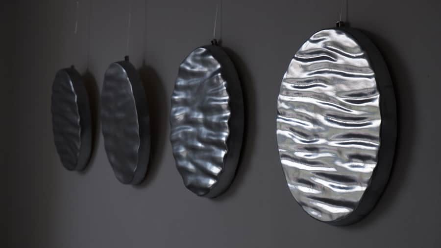 Fascinirana poetikom prirode – valovima koji se kontinuirano dižu formirajući zadivljujuće volumene te obrušavaju i nestaju u vodenoj masi, rijekama koje odražavaju stvaralačku silu prirode i protočnost vremena, ali i jezerima koja svojom statičnošću utjelovljuju mir i potiču na razmišljanje – Lucija Marin oblikuje devet reljefa koji prikazuju različite površine namreškane vode. Reljefi nose naziv “Sjećanje vode” jer namjera autorice nije imitirati viđeno već utjeloviti doživljeno koristeći vlastita sjećanja, emocije i pohranjene vizualne bilješke. Reljefi prikazuju vodoravna gibanja gušće ili rjeđe nanizanih izmjena konkavnih i konveksnih formi pri čemu se, ovisno o kutu loma oblika, stvaraju blaže ili oštrije izmjene svjetlosti i sjene. Kružne forme reljefa bude simboliku cikličnosti života, asociraju na formu ljudskog oka i simbolički ocrtavaju priziv sjećanja, doživljaja i emocija. Unutarnji apstraktni impuls autorice gradi priču namreškanih površina utemeljenu na sjećanjima i osjećajima kao što kora drveta ili površina zemlje nosi tragove i iskustva prošlih vremena spremna za pohranu bilješki budućih događaja. Boja i tekstura površine vode mijenja se ovisno o okolini i atmosferilijama, a te promjene slijede i radovi čiji doživljaj ovisi o karakteru i osvjetljenju izložbenog prostora, ali i kretanju promatrača. Reljefi smješteni u horizontalni niz ne čine jednu zajedničku površinu već ističu segmente različitih sjećanja i emocija utjelovljenih kroz bogatstvo, raznolikost i sličnost vodenih površina, njihovu kratkotrajnost i nevjerojatnu mogućnost transformacije koja otvara uvijek nove dimenzije percepcije i doživljaja. Djela su nadopunjena video projekcijom snimaka mora, rijeka i jezera koje je Lucija Marin posjetila, snimila i dokumentirala u proteklih nekoliko godina, a koji čine svojevrsnu online izložbu na Instagram profilu “water_diary”.